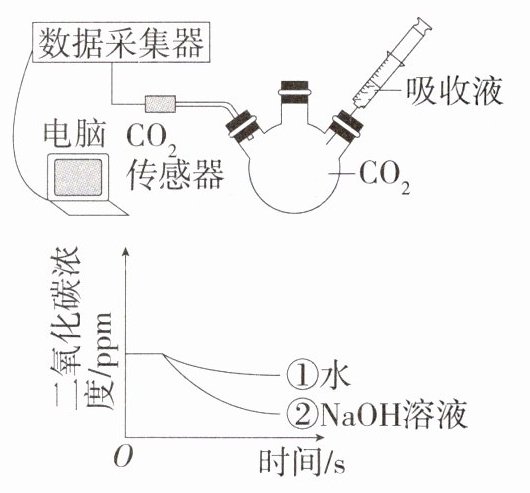 6. 数字化实验 (2024吉林四平伊通二模改编) 实验小组用传感器研究等量水、饱和NaOH溶液和饱和Ca(OH)₂溶液分别吸收CO₂的效果(氢氧化钙微溶于水,氢氧化钠易溶于水),实验装置及部分测定结果如图所示。下列说法错误的是 ( )