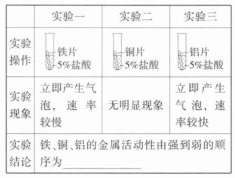 某研究小组为探究铁、铜、铝的金属活动性顺序,进行了如下三个实验(其中金属均已打磨,且形状、大小相同,试管中所用 5%的盐酸体积相同)。