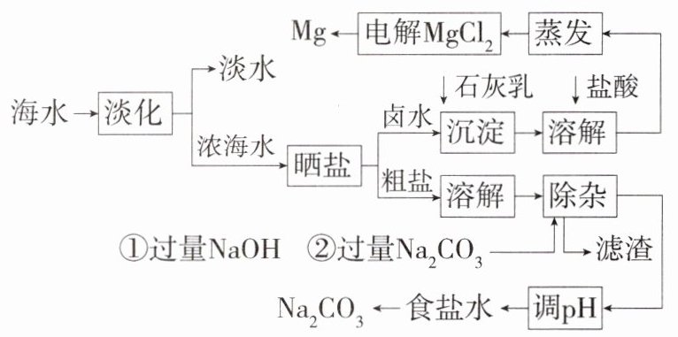 (4)海水制“碱”:在用粗盐(含 MgCl₂、CaCl₂杂质)制纯碱过程中,除杂时,先后加入过量的 NaOH 溶液和 Na₂CO₃溶液产生的沉淀分别是____________,写出任意一个产生沉淀的化学方程式:____________________;由氯化钠制取纯碱先通氨气再通二氧化碳的原因是____________________。