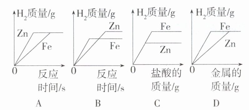 D.向等质量、等质量分数的稀盐酸中不断加入等质量的铁和锌