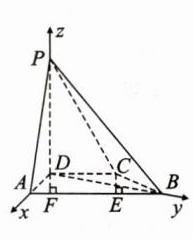 (1)【证明】\(\because CD\parallel AB\),\(AD = CB = 1\),\(DC\neq AB\),\(\therefore\) 四边形 \(ABCD\) 是等腰梯形。如图,过点 \(C\) 作 \(CE\perp AB\) 于 \(E\),过点 \(D\) 作 \(DF\perp AB\) 于点 \(F\),则 \(AF = BE=\frac{1}{2}(AB - CD)=\frac{1}{2}\),\(CD = EF\)。又 \(AD = 1\),\(\therefore DF=\sqrt{AD^{2}-AF^{2}}=\frac{\sqrt{3}}{2}\)。又 \(BF = EF + BE=\frac{3}{2}\),\(\therefore BD=\sqrt{BF^{2}+DF^{2}}=\sqrt{3}\)。又 \(AD = 1\),\(AB = 2\),\(\therefore AD^{2}+BD^{2}=AB^{2}\),\(\therefore AD\perp BD\)。\(\because PD\perp\) 平面 \(ABCD\),\(BD\subset\) 平面 \(ABCD\),\(\therefore PD\perp BD\)。又 \(AD\cap PD = D\),\(\therefore BD\perp\) 平面 \(PAD\)。\(\because PA\subset\) 平面 \(PAD\),\(\therefore BD\perp PA\)。 - (2)【解】以 \(D\) 为原点,\(DA,DB,DP\) 所在直线分别为 \(x\) 轴、\(y\) 轴、\(z\) 轴建立空间直角坐标系,则 \(D(0,0,0)\),\(A(1,0,0)\),\(B(0,\sqrt{3},0)\),\(P(0,0,\sqrt{3})\),\(\therefore\overrightarrow{PD}=(0,0,-\sqrt{3})\),\(\overrightarrow{PA}=(1,0,-\sqrt{3})\),\(\overrightarrow{PB}=(0,\sqrt{3},-\sqrt{3})\)。设平面 \(PAB\) 的法向量为 \(\boldsymbol{n}=(x,y,z)\),则 \(\begin{cases}\overrightarrow{PA}\cdot\boldsymbol{n}=0\\\overrightarrow{PB}\cdot\boldsymbol{n}=0\end{cases}\),即 \(\begin{cases}x-\sqrt{3}z = 0\\\sqrt{3}y-\sqrt{3}z = 0\end{cases}\)。取 \(z = 1\),得 \(x=\sqrt{3}\),\(y = 1\),则 \(\boldsymbol{n}=(\sqrt{3},1,1)\)。设直线 \(PD\) 与平面 \(PAB\) 所成的角为 \(\theta\),则 \(\sin\theta=|\cos\langle\boldsymbol{n},\overrightarrow{PD}\rangle|=\frac{|\boldsymbol{n}\cdot\overrightarrow{PD}|}{|\boldsymbol{n}||\overrightarrow{PD}|}=\frac{\sqrt{3}}{\sqrt{5}\times\sqrt{3}}=\frac{\sqrt{5}}{5}\)。\(\therefore PD\) 与平面 \(PAB\) 所成的角的正弦值为 \(\frac{\sqrt{5}}{5}\)。