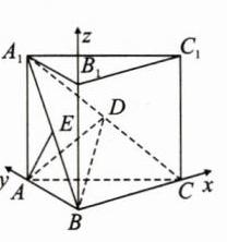 (1)【解】设点 \(A\) 到平面 \(A_{1}BC\) 的距离为 \(h\)。\(\because V_{三棱锥A_{1}-ABC}=V_{三棱锥A - A_{1}BC}=\frac{1}{3}V_{三棱柱ABC - A_{1}B_{1}C_{1}}=\frac{4}{3}\),\(\therefore\frac{1}{3}\cdot S_{\triangle A_{1}BC}\cdot h=\frac{4}{3}\)。\(\because S_{\triangle A_{1}BC}=2\sqrt{2}\),\(\therefore h=\sqrt{2}\)。\(\therefore\) 点 \(A\) 到平面 \(A_{1}BC\) 的距离为 \(\sqrt{2}\)。 - (2)如图,取 \(A_{1}B\) 的中点 \(E\),连接 \(AE\)。\(\because AA_{1}=AB\),\(\therefore AE\perp A_{1}B\)。\(\because\) 平面 \(A_{1}BC\perp\) 平面 \(ABB_{1}A_{1}\),平面 \(A_{1}BC\cap\) 平面 \(ABB_{1}A_{1}=A_{1}B\),\(AE\subset\) 平面 \(ABB_{1}A_{1}\),\(\therefore AE\perp\) 平面 \(A_{1}BC\),\(\therefore AE = h=\sqrt{2}\),则 \(AA_{1}=AB = 2\)。\(\because AE\perp\) 平面 \(A_{1}BC\),\(BC\subset\) 平面 \(A_{1}BC\),\(\therefore AE\perp BC\)。\(\because A_{1}A\perp BC\),\(AE\cap A_{1}A = A\),\(AE,A_{1}A\subset\) 平面 \(ABB_{1}A_{1}\),\(\therefore BC\perp\) 平面 \(ABB_{1}A_{1}\)。\(\because AB\subset\) 平面 \(ABB_{1}A_{1}\),\(\therefore BC\perp AB\)。由 \(V_{三棱柱ABC - A_{1}B_{1}C_{1}}=S_{\triangle ABC}\cdot A_{1}A=\frac{1}{2}AB\cdot BC\cdot A_{1}A=\frac{1}{2}\times2\times BC\times2 = 4\),解得 \(BC = 2\)。以 \(B\) 为原点,分别以 \(BC,BA,BB_{1}\) 所在直线为 \(x\) 轴、\(y\) 轴、\(z\) 轴建立空间直角坐标系,则 \(B(0,0,0)\),\(A(0,2,0)\),\(E(0,1,1)\),\(D(1,1,1)\)。\(\therefore\overrightarrow{AE}=(0,-1,1)\),\(\overrightarrow{BD}=(1,1,1)\),\(\overrightarrow{BA}=(0,2,0)\)。由上述分析知,平面 \(BDC\) 的一个法向量为 \(\overrightarrow{AE}=(0,-1,1)\)。设平面 \(BDA\) 的法向量为 \(\boldsymbol{n}=(x,y,z)\),则 \(\begin{cases}\overrightarrow{BA}\cdot\boldsymbol{n}=0\\\overrightarrow{BD}\cdot\boldsymbol{n}=0\end{cases}\),\(\therefore\begin{cases}2y = 0\\x + y+z = 0\end{cases}\)。取 \(x = 1\),则 \(y = 0\),\(z=-1\),\(\therefore\boldsymbol{n}=(1,0,-1)\),\(\therefore\cos\langle\overrightarrow{AE},\boldsymbol{n}\rangle=\frac{\overrightarrow{AE}\cdot\boldsymbol{n}}{|\overrightarrow{AE}||\boldsymbol{n}|}=\frac{0 + 0-1}{\sqrt{2}\times\sqrt{2}}=-\frac{1}{2}\)。设二面角 \(A - BD - C\) 的平面角为 \(\alpha(0\leqslant\alpha\leqslant\pi)\),则 \(\sin\alpha=\sqrt{1-\cos^{2}\alpha}=\frac{\sqrt{3}}{2}\),\(\therefore\) 二面角 \(A - BD - C\) 的正弦值为 \(\frac{\sqrt{3}}{2}\)。