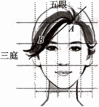 9. 美术绘图中常采用“三庭五眼”作图法. 三庭:将整个脸部按照发际线至眉骨,眉骨至鼻底,鼻底至下颏的范围分为上庭、中庭、下庭,各占脸长的$\frac{1}{3}$. 五眼:指脸的宽度比例,以眼形长度为单位,把脸的宽度自左至右分成第一眼、第二眼、第三眼、第四眼、第五眼五等份. 如图,假设三庭中一庭的高度为2 cm,五眼中一眼的宽度为1 cm,若图中提供的直线$AB$近似记为该人像的刘海边缘,且该人像的鼻尖位于中庭下边界和第三眼的中点,则该人像鼻尖到刘海边缘的距离约为 ( )