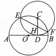 【证明】如图,以$O$为原点,$AB$所在直线为$x$轴,建立平面直角坐标系。 设$|AB|=2r$,$D(a,0)$,则$|CD|=\sqrt{r^{2}-a^{2}}$, $\therefore C(a,\sqrt{r^{2}-a^{2}})$。 $\therefore$圆$O:x^{2}+y^{2}=r^{2}$,圆$C:(x - a)^{2}+(y-\sqrt{r^{2}-a^{2}})^{2}=r^{2}-a^{2}$。 两方程作差得直线$EF$的方程为$2ax + 2\sqrt{r^{2}-a^{2}}y=r^{2}+a^{2}$。 令$x = a$,得$y=\frac{1}{2}\sqrt{r^{2}-a^{2}}$, $\therefore H(a,\frac{1}{2}\sqrt{r^{2}-a^{2}})$,即$H$为$CD$的中点。 $\therefore EF$平分$CD$。