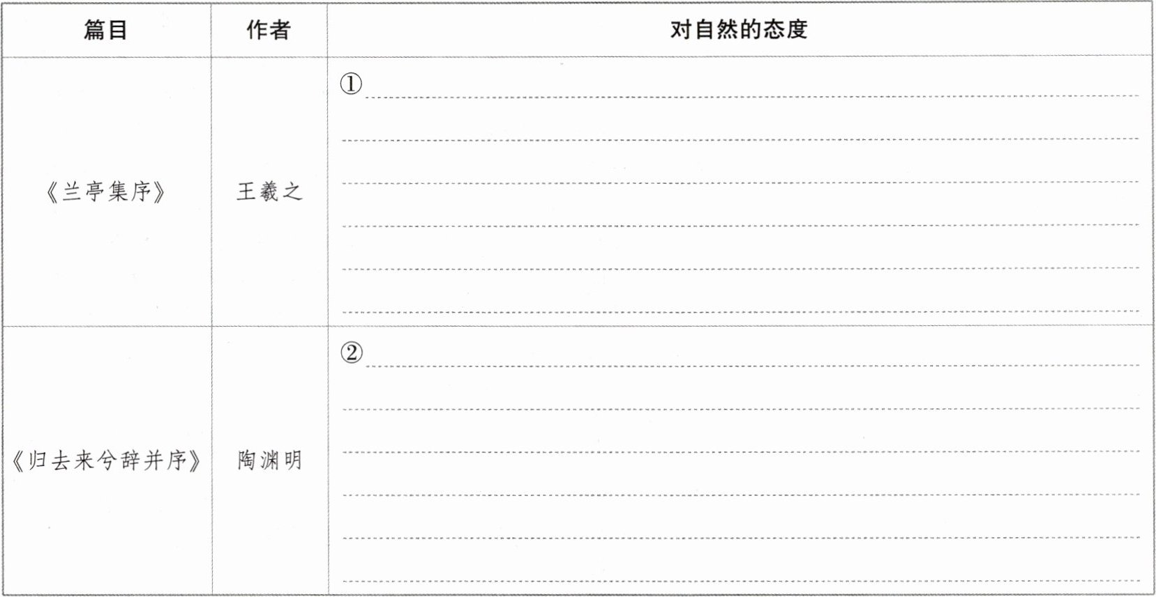 1. 王羲之和陶渊明都寄情山水,但他们对自然的态度不同。请结合文本进行探讨,完成表格。