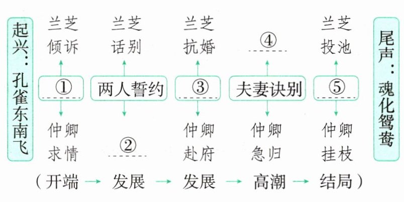 ①焦母怒遣;②仲卿送行;③阿兄逼婚;④兰芝迎夫;⑤双双殉情。