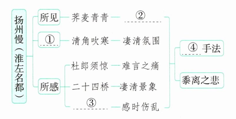 ①萧条景象②扬州昔日的繁华③祖国山河破碎④郁 愤、悲痛5爱国之情