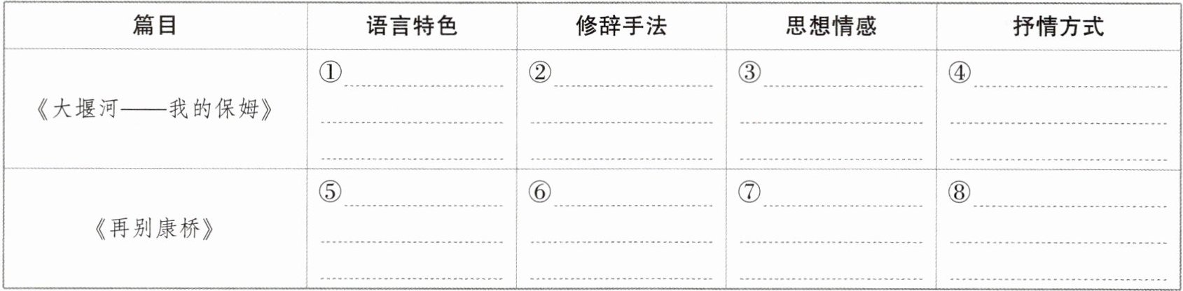 对比《大堰河——我的保姆》《再别康桥》的语言特色、修辞手法、思想情感和抒情方式,完成表格。