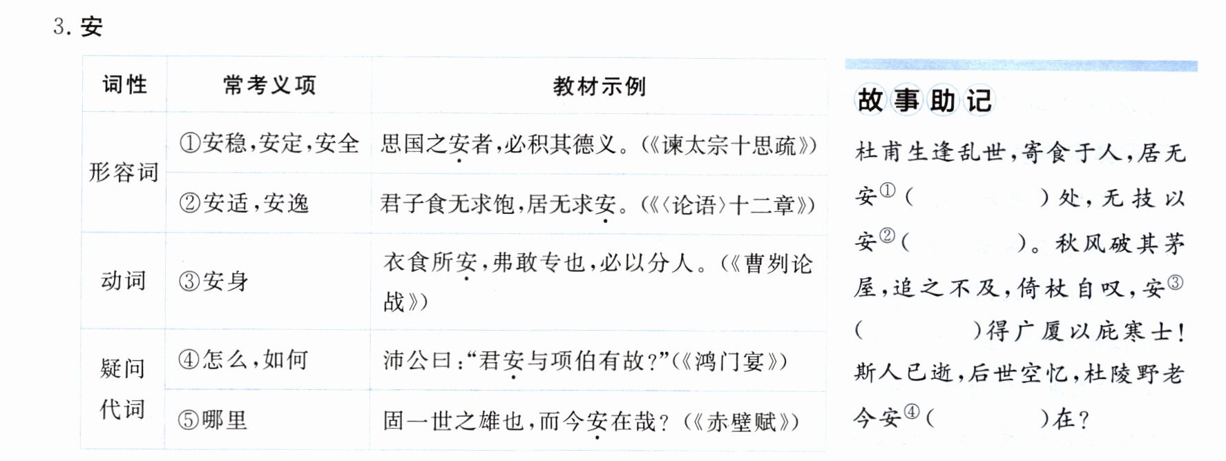 3.①安稳,安定,安全 ②安身 ③怎么,如何 ④哪里