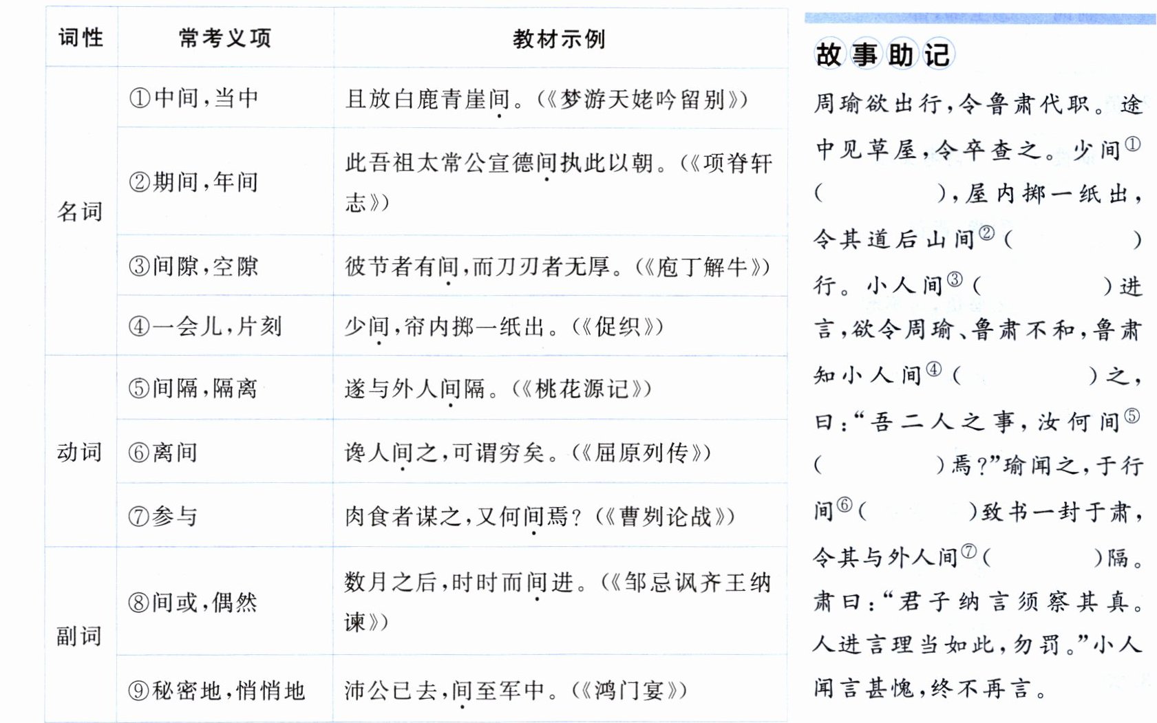 5.①一会儿,片刻 ②秘密地,悄悄地 ③间或,偶然 ④离间 ⑤参与 ⑥空隙 ⑦间隔,隔离