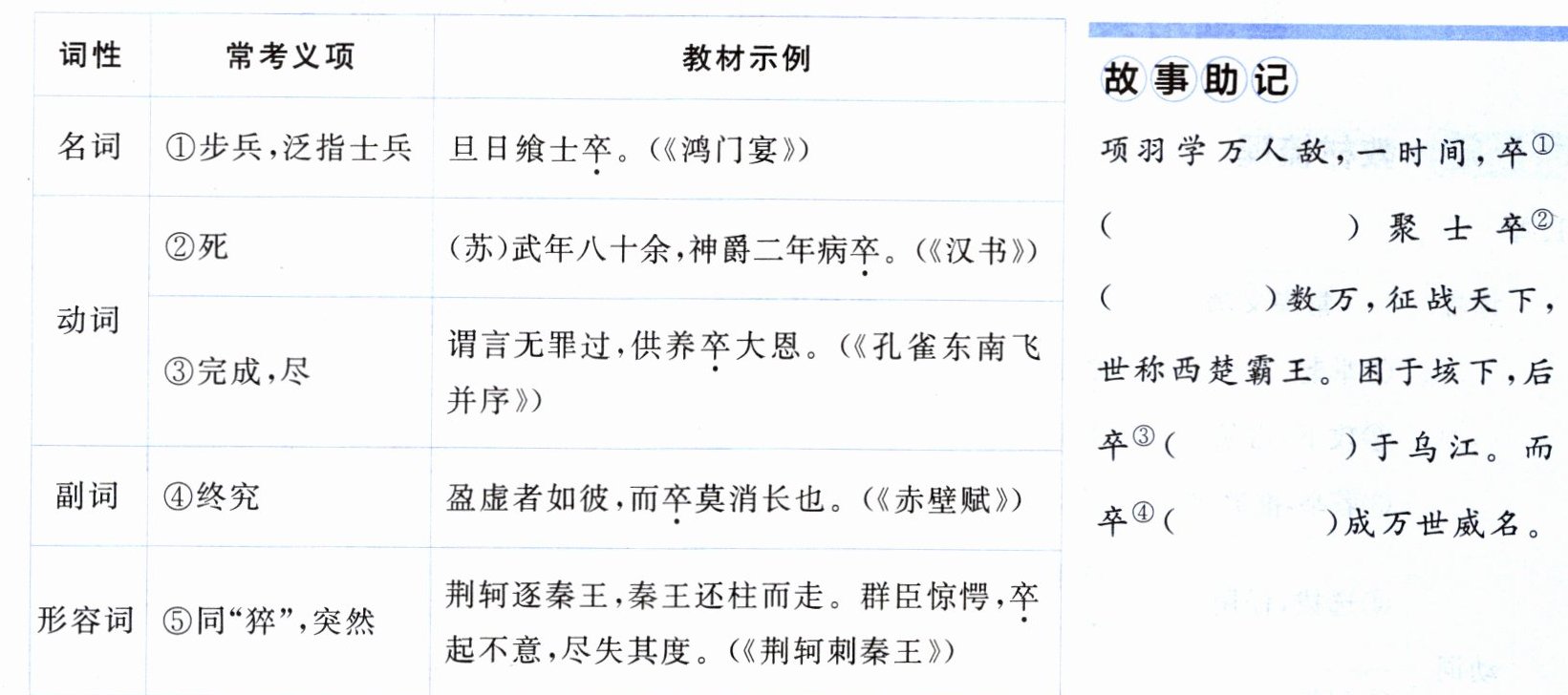 4.①同“猝”,突然 ②士兵 ③死 ④终究