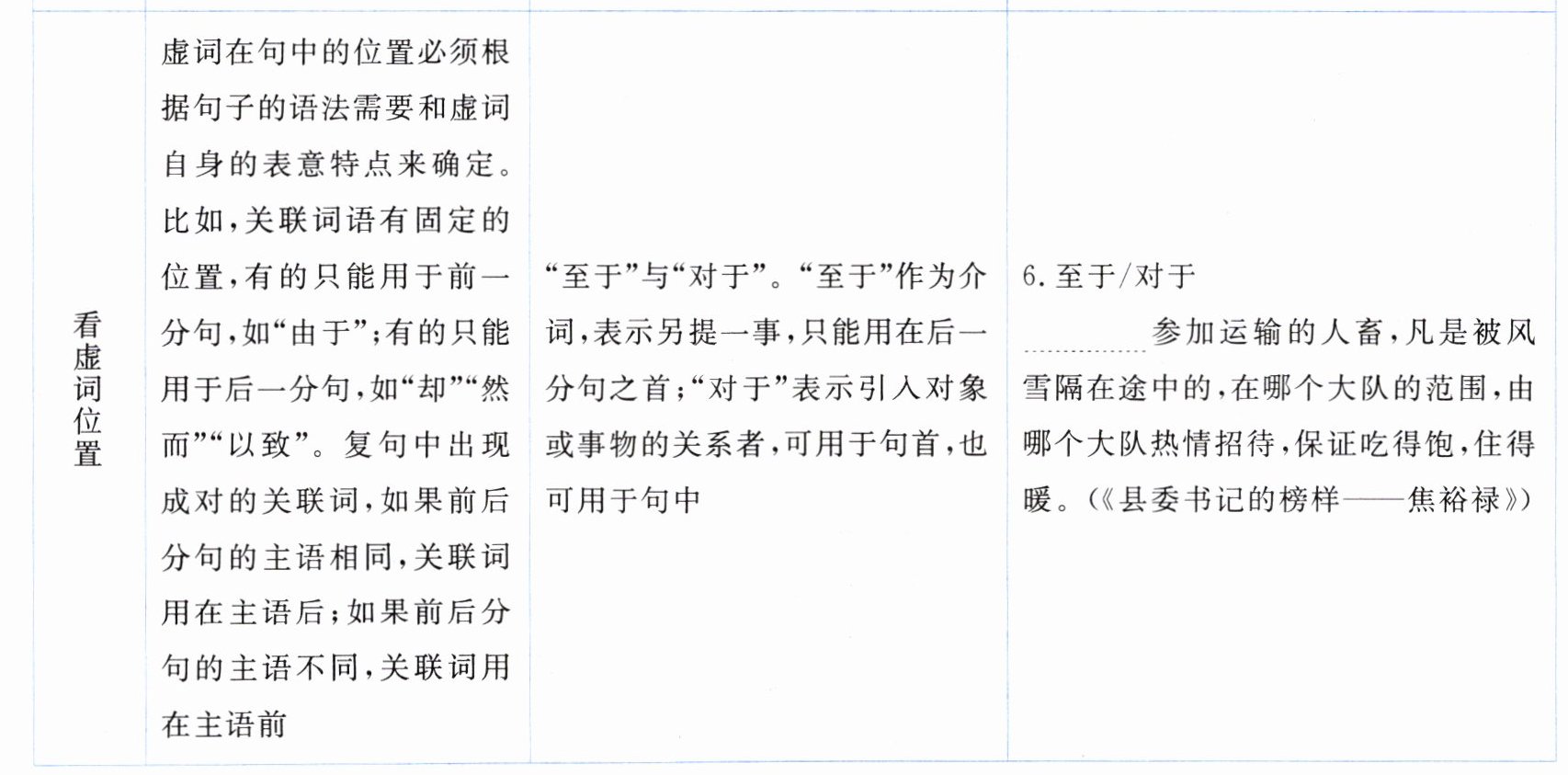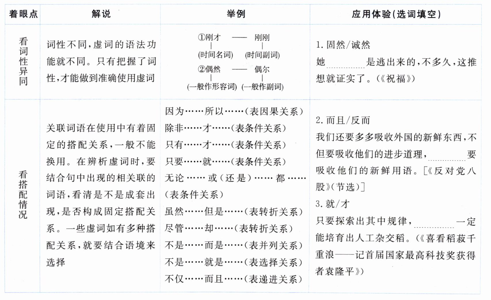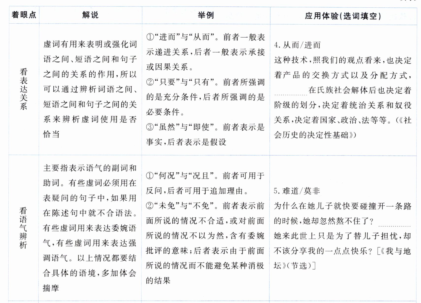 1答案诚然 解析“固然”,转折连词,表示承认某个事实,引起下文转折。 “诚然”除与“固然”有同样的语法功能外,还可作副词,表“实在” 之意。 2答案而且 解析“不但……而且……”表递进关系,强调说明。“不但…… 反而……”表对比转折关系。 3答案就 解析“只要……就……”表示充分条件关系;“只有…… 才……”表示必要条件关系。 4答案从而 解析“从而”后面是结果或进一步的行动,表示因果或承接关 系;“进而”表示递进关系,继续往前,在已有的基础上进一步。 5答案莫非 解析“难道”加强反问的语气;表示揣测的语气。“莫非”表示 揣测或反问,常跟“不成”呼应,语气不如“难道”强烈。 6答案对于 解析“至于”作为介词,表示另提一事,只能用在后一分句之 首;“对于”表示引入对象或事物的关系者,可用于句首,也可用 于句中。
