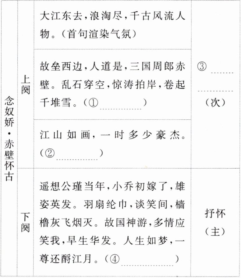 2. 根据对《念奴娇·赤壁怀古》结构特点的理解,完成填空。