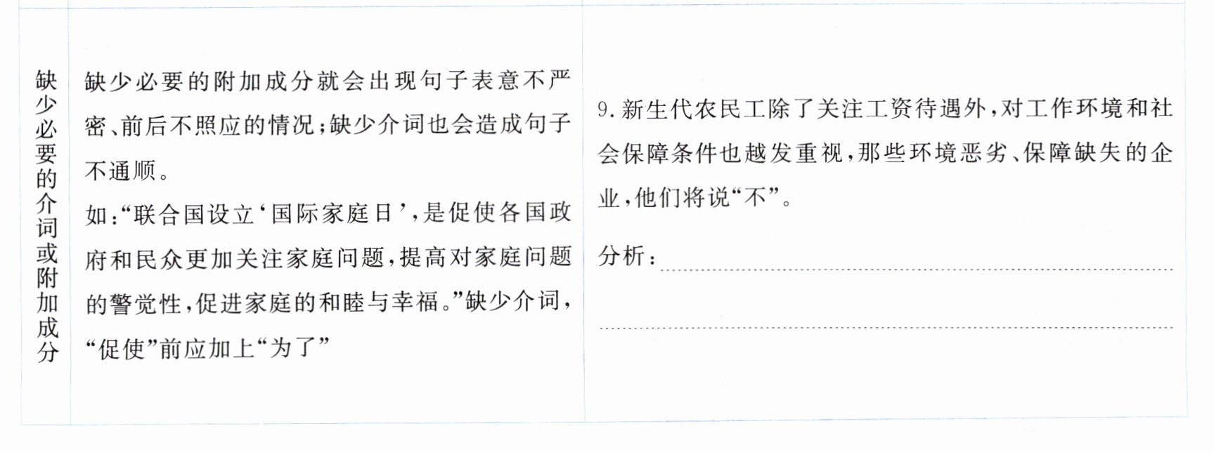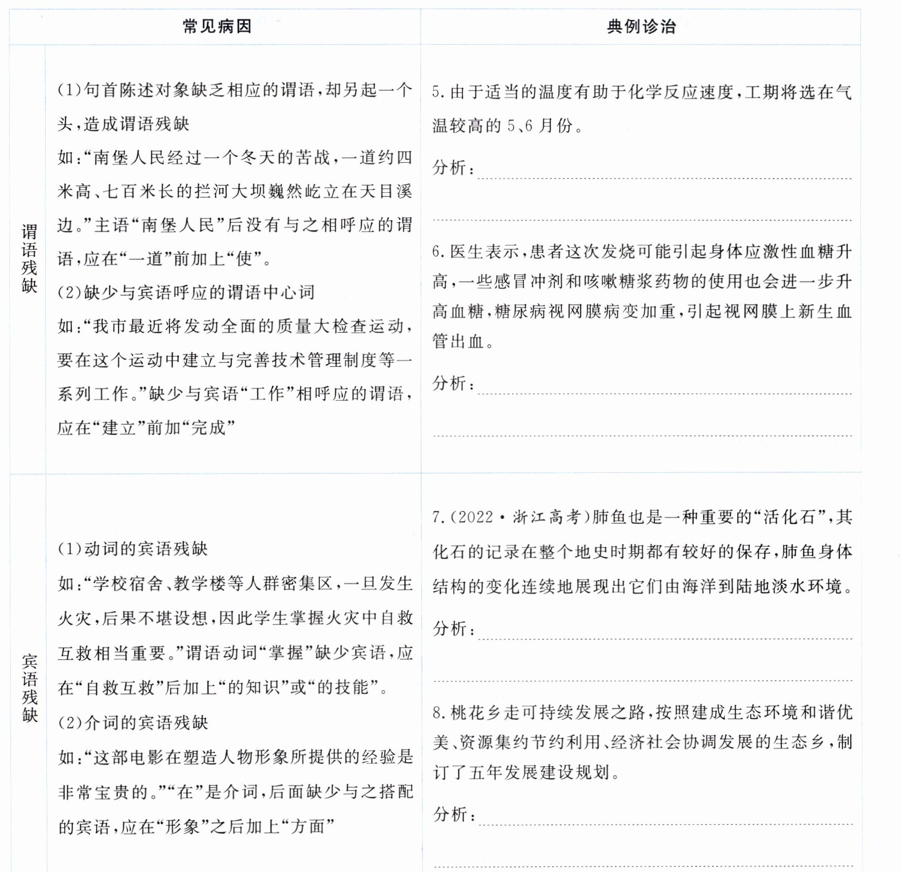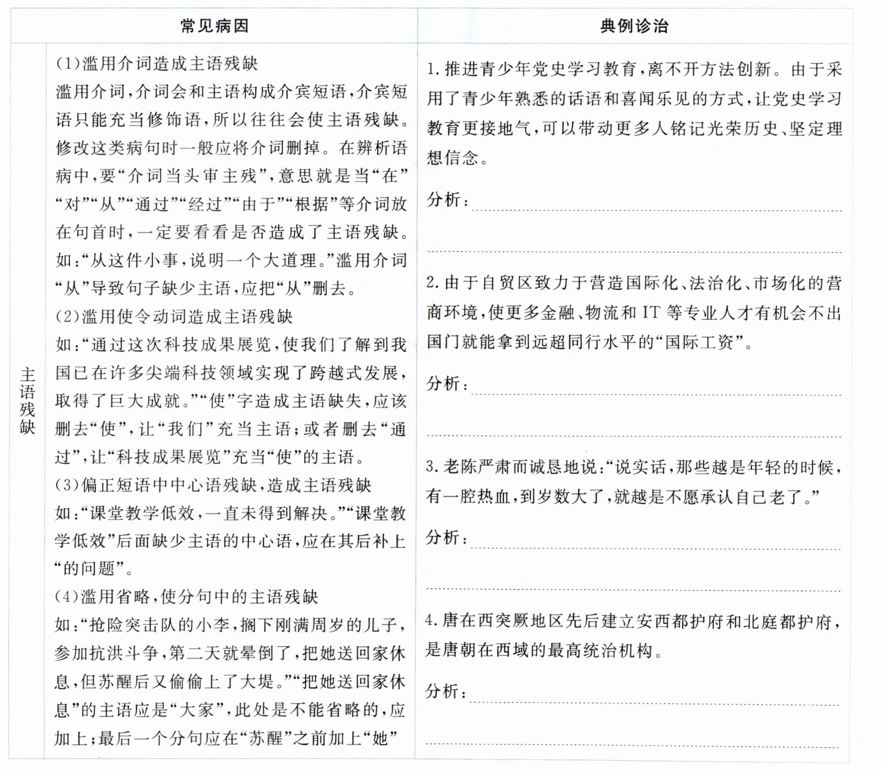 1.滥用介词导致主语残缺,应删掉“由于”。 2.因句首有介词“由于”而使主语残缺,应删掉“由于”。 3.句子缺少主语的中心语,在“一腔热血”后加“的人”。 4.滥用省略导致主语残缺,应在“是”前加“它们”。 5.“适当的温度”对“化学反应速度”有怎样的影响表述不清,应在“化学反应速度”前面添加“提高”这个谓语动词。 6.“糖尿病……病变加重”前缺少谓语动词,可在“糖尿病”前加“导致”或“使”。 7.“展现”后面缺少与之搭配的宾语中心词,应在“淡水环境”的后面加上“的适应过程”。 8.介词“按照”缺少宾语中心语,可在“生态乡”后加“的要求”。 9.介词残缺,应在“那些环境恶劣”前加“对”。