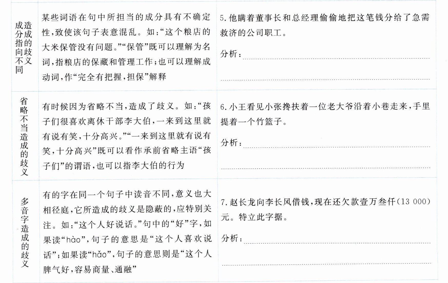 7.多音字造成的歧义。“还”字,如果读“hái”,句意是“赵仍然欠李13000元”;如果读“huán”,句意则是“赵已将欠款13000元还给李”。
