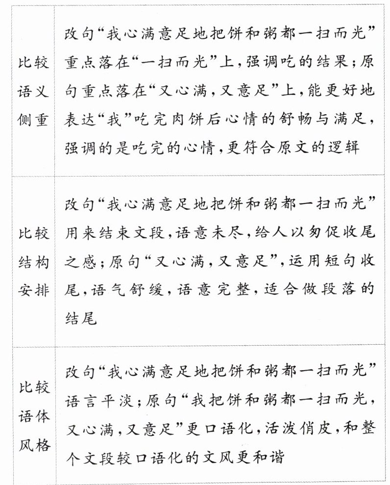 ①语义侧重:改句重点落在“一扫而光”上,强调吃的结果;原句重点落在“又心满,又意足”上,强调“我”吃完肉饼后心情的舒畅与满足,更符合原文的逻辑。