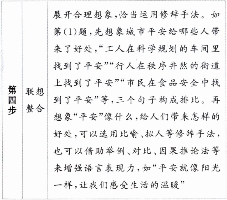 (1)(示例)春风吹拂,把平安吹到了城市里每个人的心中。工人在科学规划的车间里找到了平安,行人在秩序井然的街道上找到了平安,市民在食品安全中找到了平安。平安像阳光一样,紧紧包围着我们,让我们体味着生活的美好。
