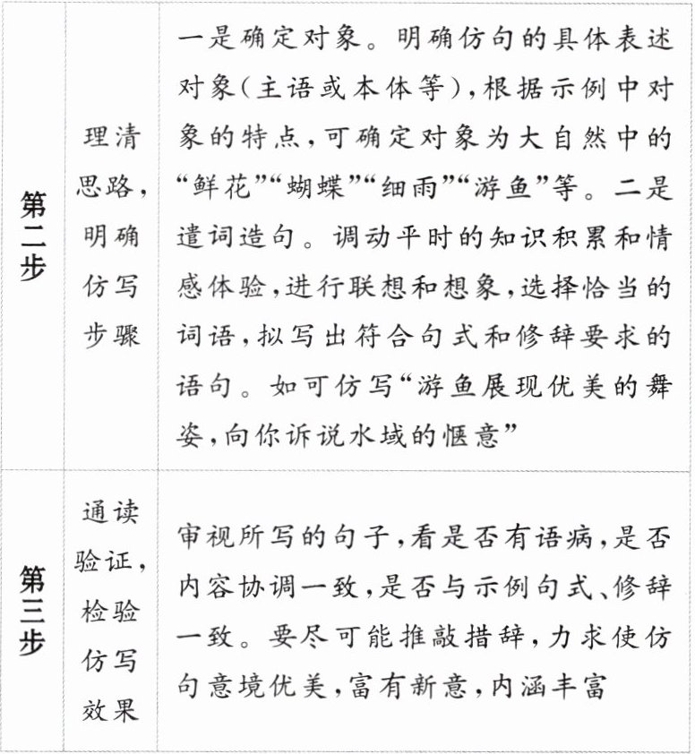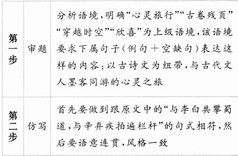 解析 本题考查仿写句子的能力。仿写句子应做到与例句形似神似。“形似”即在句式结构上与例句保持一致,由例句“曹植《七步诗》里有‘豆在釜中泣’的句子”可知,所仿写句子应遵循“出处+举例”这一形式。“神似”要求在内容情感上与例句保持一致。例句中包含“破釜沉舟”中的“釜”,根据后文“这里的‘釜’和‘舟’……意思相同”可知,所仿写句子中应包含“破釜沉舟”中的“舟”,故所举的例子应含有“舟”字。据此仿写即可。