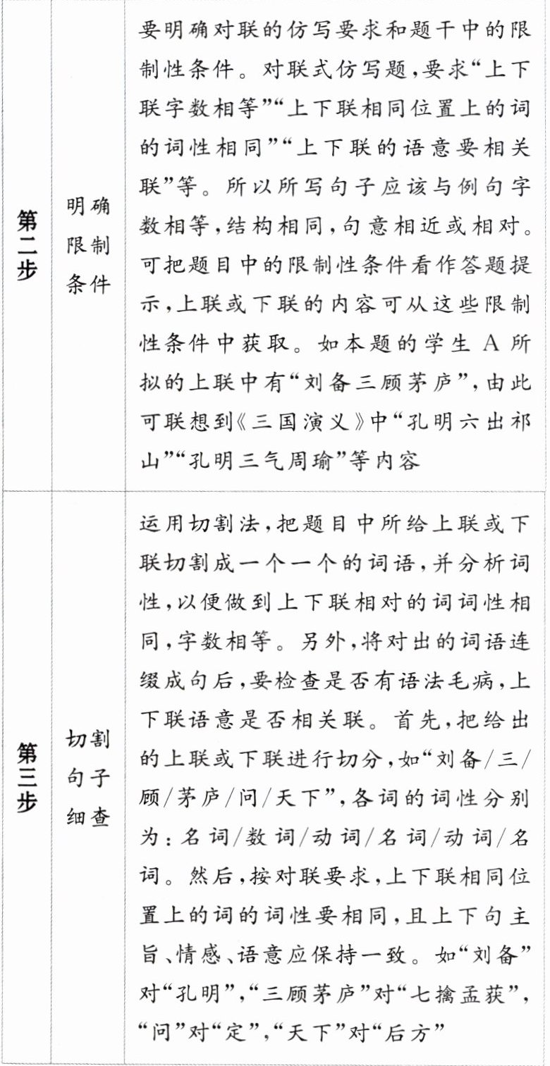 解析 这是一道对联式仿写题,但不是让考生去拟写对联,而是给定了内容让考生去重新组合,实际上考查的是一种连缀能力。需要从内容和形式两个方面去考虑,内容上要符合节日的特点,形式上要符合对联的特点。“江边柳线”与“门上桃符”有明显的春节的特征,“绿”与“红”相对,上下联尾字要仄起平收,这样就很容易确定写春节的对联。同样“青艾驱瘴”“碧波竞舟”具有典型的端午节特征,“驱瘴”的只能是“千家”,再根据对联仄起平收的要求,写端午的对联也很容易确定。