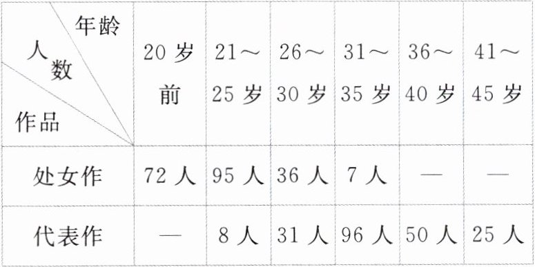 1. 有研究者从发表处女作和代表作的年龄两个方面对 200 多位作家进行了统计。比较图表中两组数据,从作家渐至成熟的角度归纳出一个结论。