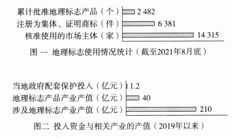 (2)依据“地理标志是促进区域特色经济发展的有效载体,是推进乡村振兴的有力支撑”可概括为:促进区域特色经济发展,推进乡村振兴。依据“地理标志打响了特色产品的品牌……蓬勃发展的地理标志产品带动了上下游产业发展”可概括为:打响了特色产品的品牌,带动上下游产业发展。图一是“地理标志使用情况统计”,依据“2482”“6381”“14315”等数字的比较可概括为:惠及的市场主体数量多。图二是“投入资金与相关产业的产值”,通过“1.2”“40”“210”等数字的比较可概括为:带动的产业产值高。