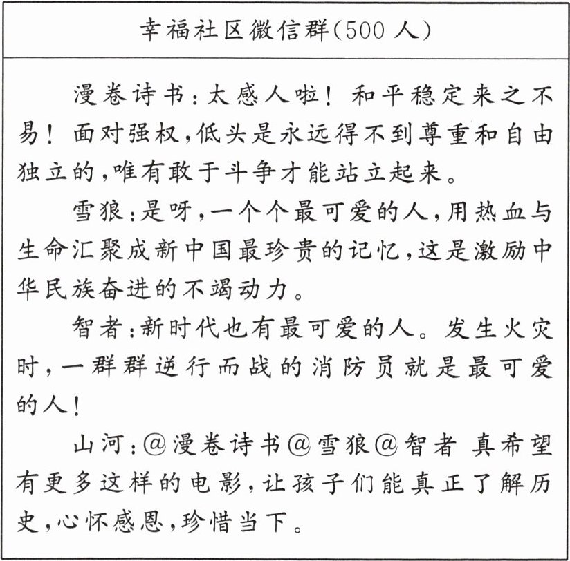 材料四 下面是幸福社区民众观看电影《长津湖》后在微信群里的对话: