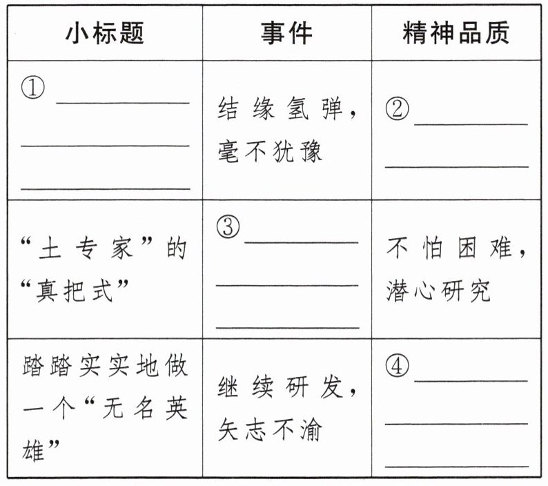 @@①【示例】“我不能有另一种选择” ②祖国利益高于一切 ③研制氢弹,历尽艰辛 ④默默奉献,鞠躬尽瘁