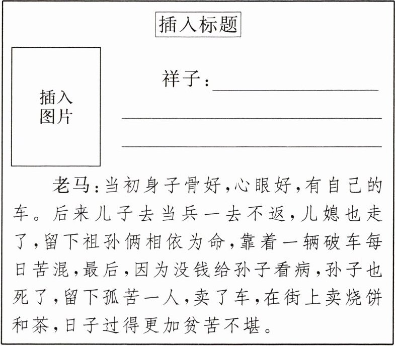 (2)请你根据小语介绍老马的文字,结合名著内容,完成对祥子的介绍。(限80字以内)