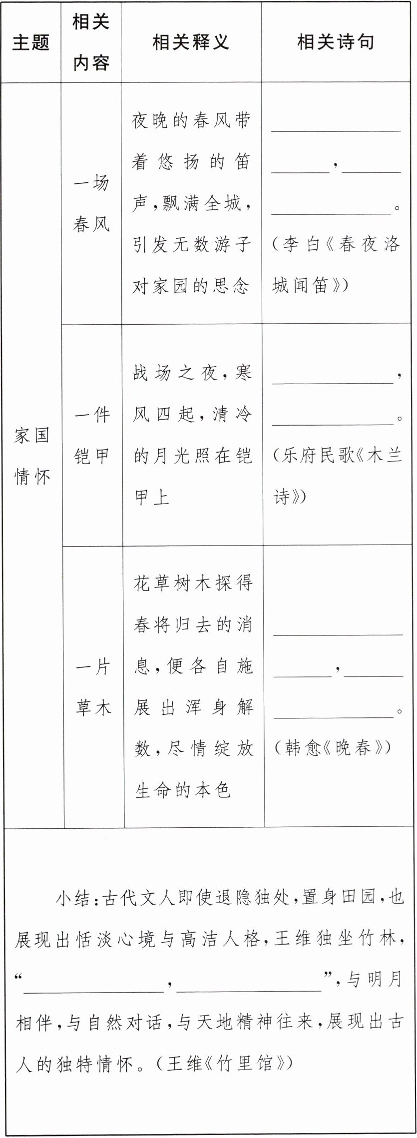 4.(2024·三明期中)小语对传统文化中的瑰宝——古诗文非常感兴趣,搜集了许多有关家国情怀的诗歌,请你帮小语补全内容。