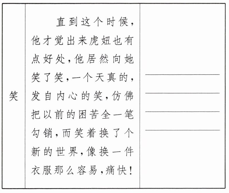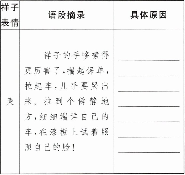 7. 老舍在谈人物描写时提到:“哭有多种,笑也不同,应依个人的特性与情形而定如何哭,如何笑。”表情是人物在某一特定处境下自我心理的外在投射,请参考示例完成批注,按要求分析下列表格中祥子表情背后的具体原因。