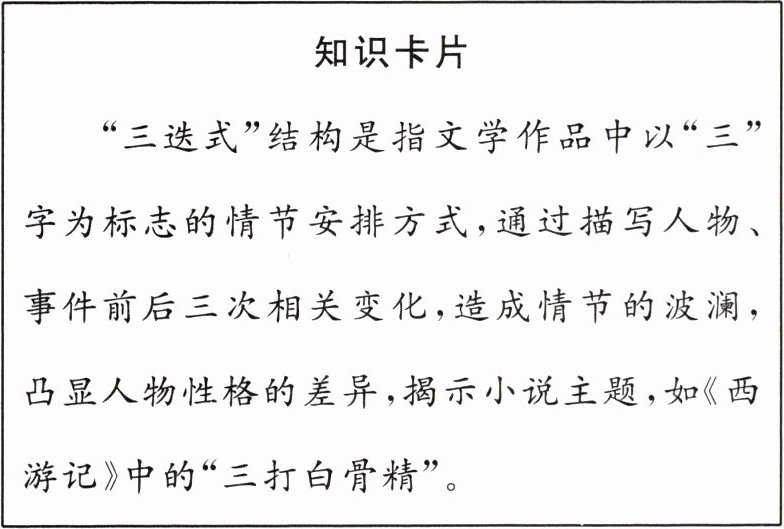 8. 有人说小说《骆驼祥子》传承了古典小说“三迭式”结构。请你阅读下面知识卡片,结合小说情节,分析《骆驼祥子》中“三迭式”结构的作用。