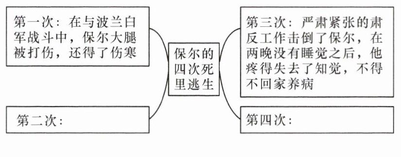 1. 新课标 整本书阅读在《钢铁是怎样炼成的》一书中,保尔至少经历了四次死里逃生。请你根据自己的阅读所得完成下面的思维导图。