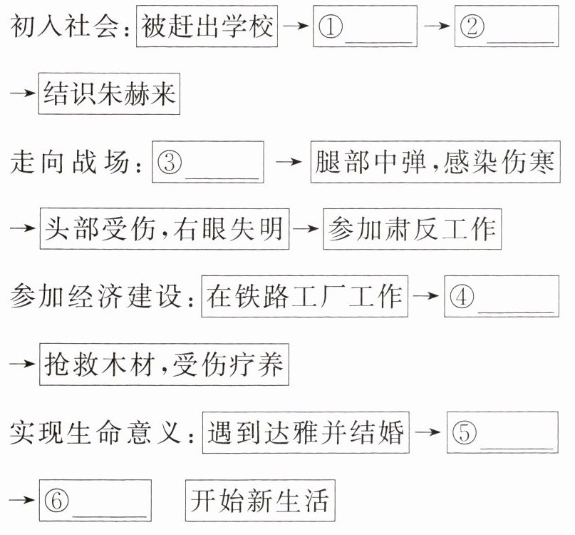1. 新课标 整本书阅读小福同学在阅读《钢铁是怎样炼成的》过程中,将主人公保尔所经历的重要事件进行了概括。请将下列事件按顺序填入相应的横线上。(填字母即可)