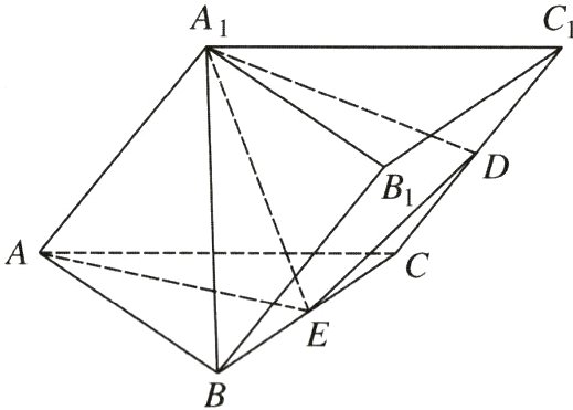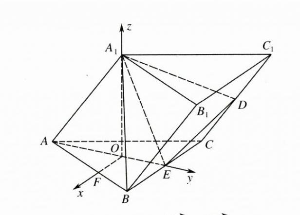 棱柱的结构特征+空间中直线与平面的位置关系+二面角 解:(Ⅰ)证明:如图,设点$O$为$\triangle ABC$的中心,连接$A_{1}O$,易知点$O$在$AE$上,且$AE\perp BC$,$A_{1}O\perp$平面$ABC$. 因为$BC\subset$平面$ABC$, 所以$A_{1}O\perp BC$.(2 分) 又因为$A_{1}O\cap AE = O$,$A_{1}O$,$AE\subset$平面$AEA_{1}$, 所以$BC\perp$平面$AEA_{1}$(题眼).(4 分) 因为$AA_{1}\subset$平面$AEA_{1}$,所以$BC\perp AA_{1}$. 又因为$AA_{1}\parallel BB_{1}\parallel CC_{1}$, 所以$BC\perp BB_{1}$,且$BC\perp CC_{1}$, 又$BB_{1}=CC_{1}$, 所以四边形$BCC_{1}B_{1}$是矩形.(6 分) 因为$BC = BB_{1}$,所以矩形$BCC_{1}B_{1}$是正方形.(7 分) (Ⅱ)在线段$AB$上取点$F$,使得$\overrightarrow{AF}=2\overrightarrow{FB}$,连接$OF$,则$OF$,$OE$,$OA_{1}$两两垂直, 故以$O$为坐标原点,$\overrightarrow{OF}$,$\overrightarrow{OE}$,$\overrightarrow{OA_{1}}$的方向分别为$x$轴、$y$轴和$z$轴的正方向建立空间直角坐标系,如图所示(题眼), 则$A(0,-\sqrt{3},0)$,$A_{1}(0,0,\sqrt{6})$,$C(-\frac{3}{2},\frac{\sqrt{3}}{2},0)$,$D(-\frac{3}{2},\sqrt{3},\frac{\sqrt{6}}{2})$,$E(0,\frac{\sqrt{3}}{2},0)$, 所以$\overrightarrow{DA_{1}}=(\frac{3}{2},-\sqrt{3},\frac{\sqrt{6}}{2})$,$\overrightarrow{DE}=(\frac{3}{2},-\frac{\sqrt{3}}{2},-\frac{\sqrt{6}}{2})$, 由(Ⅰ)知,$BC\perp$平面$AEA_{1}$,则平面$AEA_{1}$的一个法向量不妨取$\boldsymbol{m}=(1,0,0)$, 设平面$A_{1}ED$的法向量为$\boldsymbol{n}=(x,y,z)$, 则有$\begin{cases}\boldsymbol{n}\cdot\overrightarrow{DA_{1}}=0\\\boldsymbol{n}\cdot\overrightarrow{DE}=0\end{cases}$,即$\begin{cases}\frac{3}{2}x-\sqrt{3}y+\frac{\sqrt{6}}{2}z = 0\\\frac{3}{2}x-\frac{\sqrt{3}}{2}y-\frac{\sqrt{6}}{2}z = 0\end{cases}$,(11 分) 取$y = 1$,则$\boldsymbol{n}=(\frac{\sqrt{3}}{2},1,\frac{\sqrt{2}}{4})$,(13 分) 所以$\cos\langle\boldsymbol{m},\boldsymbol{n}\rangle=\frac{\boldsymbol{m}\cdot\boldsymbol{n}}{\vert\boldsymbol{m}\vert\vert\boldsymbol{n}\vert}=\frac{\sqrt{10}}{5}$, 故二面角$A - A_{1}E - D$的正弦值为$\frac{\sqrt{15}}{5}$.(15 分)