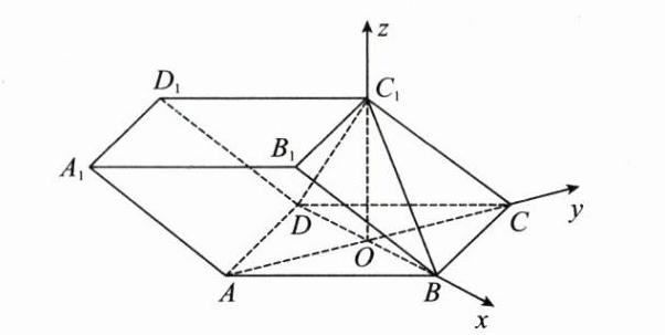 线面垂直的判定定理+二面角的正弦值+空间向量的应用 【思维导图】(Ⅰ)证法一:$\xrightarrow{空间向量的运算}C_{1}O\perp BD$;$\xrightarrow{余弦定理}C_{1}O\perp OC$;$\xrightarrow{线面垂直的判定定理}$得证. 证法二:连接$C_{1}B$,$C_{1}D$$\to C_{1}O\perp BD$$\to C_{1}O\perp OC$;$\xrightarrow{线面垂直的判定定理}$得证. (Ⅱ)建立空间直角坐标系$\xrightarrow{向量法}$二面角的正弦值. 解:(Ⅰ)证法一:$\overrightarrow{C_{1}O}=\overrightarrow{OC}+\overrightarrow{CC_{1}}=\overrightarrow{CC_{1}}-\frac{1}{2}(\overrightarrow{CB}+\overrightarrow{CD})$, $\overrightarrow{C_{1}O}\cdot\overrightarrow{BD}=[\overrightarrow{CC_{1}}-\frac{1}{2}(\overrightarrow{CB}+\overrightarrow{CD})](\overrightarrow{CD}-\overrightarrow{CB})=(\overrightarrow{CC_{1}}\cdot\overrightarrow{CD}-\overrightarrow{CC_{1}}\cdot\overrightarrow{CB})-\frac{1}{2}(\overrightarrow{CD}^{2}-\overrightarrow{CB}^{2}) = 0$, 所以$C_{1}O\perp BD$(提示:若两个非零向量的数量积为0,则这两个向量垂直). 又$CC_{1}=2$,$CO=\sqrt{2}$,$\angle C_{1}CO = 45^{\circ}$, 利用余弦定理,得$C_{1}O=\sqrt{2}$,所以$C_{1}O^{2}+OC^{2}=CC_{1}^{2}$, 所以$C_{1}O\perp OC$. 因为$BD\cap OC = O$,$BD$,$OC\subset$平面$ABCD$, 所以$C_{1}O\perp$平面$ABCD$.(6分) 证法二:连接$C_{1}B$,$C_{1}D$, 因为$\angle C_{1}CB=\angle C_{1}CD$,$CB = CD$, 所以$\triangle C_{1}CD\cong\triangle C_{1}CB$,故$C_{1}B = C_{1}D$. 又$O$为$BD$的中点,所以$C_{1}O\perp BD$. 因为$\angle C_{1}CO = 45^{\circ}$,$CC_{1}=AA_{1}=2$,$CO=\sqrt{2}$, 所以$C_{1}O=\sqrt{2}$,因此$C_{1}O\perp CO$. 因为$BD\cap CO = O$,所以$C_{1}O\perp$平面$ABCD$.(6分) (Ⅱ)以$O$为坐标原点,$\overrightarrow{OB}$的方向为$x$轴正方向,建立如图所示的空间直角坐标系$O - xyz$. 由题设得$B(\sqrt{2},0,0)$,$A(0,-\sqrt{2},0)$,$A_{1}(0,-2\sqrt{2},\sqrt{2})$,$D(-\sqrt{2},0,0)$,$\overrightarrow{AA_{1}}=(0,-\sqrt{2},\sqrt{2})$,$\overrightarrow{AB}=(\sqrt{2},\sqrt{2},0)$,$\overrightarrow{AD}=(-\sqrt{2},\sqrt{2},0)$.(9分) 设$\boldsymbol{m}=(x,y,z)$是平面$AA_{1}B$的法向量,则 $\begin{cases}\boldsymbol{m}\cdot\overrightarrow{AA_{1}} = 0\\\boldsymbol{m}\cdot\overrightarrow{AB} = 0\end{cases}$,即$\begin{cases}-\sqrt{2}y+\sqrt{2}z = 0\\\sqrt{2}x+\sqrt{2}y = 0\end{cases}$,可取$\boldsymbol{m}=(1,-1,-1)$. 设$\boldsymbol{n}=(p,q,r)$是平面$AA_{1}D$的法向量,则 $\begin{cases}\boldsymbol{n}\cdot\overrightarrow{AA_{1}} = 0\\\boldsymbol{n}\cdot\overrightarrow{AD} = 0\end{cases}$,即$\begin{cases}-\sqrt{2}q+\sqrt{2}r = 0\\-\sqrt{2}p+\sqrt{2}q = 0\end{cases}$,可取$\boldsymbol{n}=(1,1,1)$.(13分) 所以$\cos\langle\boldsymbol{m},\boldsymbol{n}\rangle=\frac{\boldsymbol{m}\cdot\boldsymbol{n}}{|\boldsymbol{m}|\cdot|\boldsymbol{n}|}=-\frac{1}{3}$. 因此二面角$B - AA_{1}-D$的正弦值为$\frac{2\sqrt{2}}{3}$.(15分)