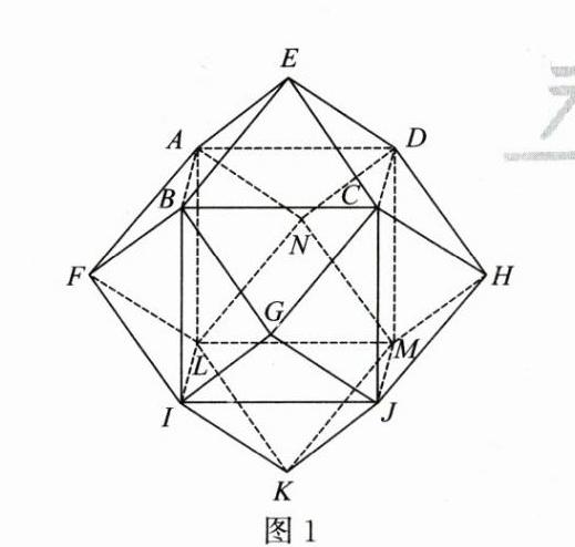 立体几何中的新定义问题+多面体的体积 【思维导图】(Ⅰ)已知条件→集合\(M\),\(P\),\(Q\)代表的点→\(P\cap M\),\(Q\cap M\)代表的点→\(S_{1}\),\(S_{2}\)→得解. (Ⅱ)记集合\(Q\)的子集\(Q'=\{(x,y,z)|x + y + z\leqslant2,x\geqslant0,y\geqslant0,z\geqslant0\}\)→\(V_{Q'}\)→\(V_{1}\)→记集合\(P\)的子集\(P'=\{(x,y,z)|0\leqslant x\leqslant1,0\leqslant y\leqslant1,0\leqslant z\leqslant1\}\)→\(P'\cap Q'\)为\(P'\)截去三棱锥\(Q_{4}-Q_{1}Q_{2}Q_{3}\)所剩下的部分→\(V_{P'\cap Q'}\)→\(V_{2}\)→得解. (Ⅲ)①解法一:已知条件→\(V_{E - ABCD}\)→\(V_{3}\); 解法二:记集合\(T\)的子集\(T'\)→\(B\),\(C\),\(D\)各点坐标→\(V_{T'}\)→\(V_{3}\). ②两平面的法向量→空间夹角公式→二面角的大小→\(W\)的面数和棱数→得解. 解:(Ⅰ)集合\(M=\{(x,y,z)|z = 0\}\)表示\(xOy\)平面上所有的点,\(P=\{(x,y,z)||x|\leqslant1,|y|\leqslant1,|z|\leqslant1\}\)表示\((\pm1,\pm1,\pm1)\)这八个顶点形成的正方体内所有的点,\(P\cap M\)可以看成正方体在\(xOy\)平面上的截面内所有的点,它是边长为2的正方形(关键:判断出截面的形状),因此\(S_{1}=4\). (2分) 对于\(Q=\{(x,y,z)||x|+|y|+|z|\leqslant2\}\),当\(x,y,z\gt0\)时,\(x + y + z = 2\)表示经过点\((2,0,0)\),\((0,2,0)\),\((0,0,2)\)的平面在第一象限的部分. 由对称性可知\(Q\)表示\((\pm2,0,0)\),\((0,\pm2,0)\),\((0,0,\pm2)\)这六个顶点形成的正八面体内所有的点,\(Q\cap M\)可以看成正八面体在\(xOy\)平面上的截面内所有的点,它是边长为\(2\sqrt{2}\)的正方形,因此\(S_{2}=8\). (4分) (Ⅱ)由题知,集合\(Q\),\(P\cap Q\)中所有点构成的几何体的体积分别为\(V_{1}\),\(V_{2}\),记集合\(Q\)的子集\(Q'=\{(x,y,z)|x + y + z\leqslant2,x\geqslant0,y\geqslant0,z\geqslant0\}\),即为三个坐标平面与\(x + y + z = 2\)围成的四面体,四面体四个顶点分别为\((0,0,0)\),\((2,0,0)\),\((0,2,0)\),\((0,0,2)\),此四面体的体积\(V_{Q'}=\frac{1}{3}\times2\times(\frac{1}{2}\times2\times2)=\frac{4}{3}\),由对称性知,\(V_{1}=8V_{Q'}=\frac{32}{3}\). (6分) 记集合\(P\)的子集\(P'\)构成的几何体为棱长为1的正方体,即\(P'=\{(x,y,z)|0\leqslant x\leqslant1,0\leqslant y\leqslant1,0\leqslant z\leqslant1\}\),\(Q'=\{(x,y,z)|x + y + z\leqslant2,x\geqslant0,y\geqslant0,z\geqslant0\}\),\(P'\cap Q'\)为两个几何体公共部分. 记\(Q_{1}(1,1,0)\),\(Q_{2}(1,0,1)\),
