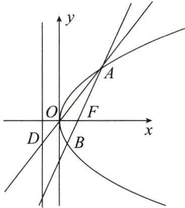 如图,$O$为坐标原点,$F$为抛物线$y^{2}=2x$的焦点,过点$F$的直线交抛物线于$A$,$B$两点,直线$AO$交抛物线的准线于点$D$,设抛物线在$B$点处的切线为$l$.