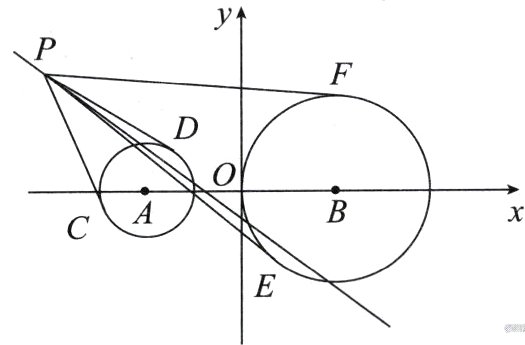 13. 如图,圆$A:(x + 2)^{2}+y^{2}=1$,圆$B:(x - 2)^{2}+y^{2}=4$,直线$3x + 4y + t = 0$上存在点$P$,过点$P$向圆$A$引两条切线$PC$和$PD$,切点是$C$和$D$,再过点$P$向圆$B$引两条切线$PE$和$PF$,切点是$E$和$F$,若$\angle CPD=\angle EPF$,则实数$t$的取值范围为_______。