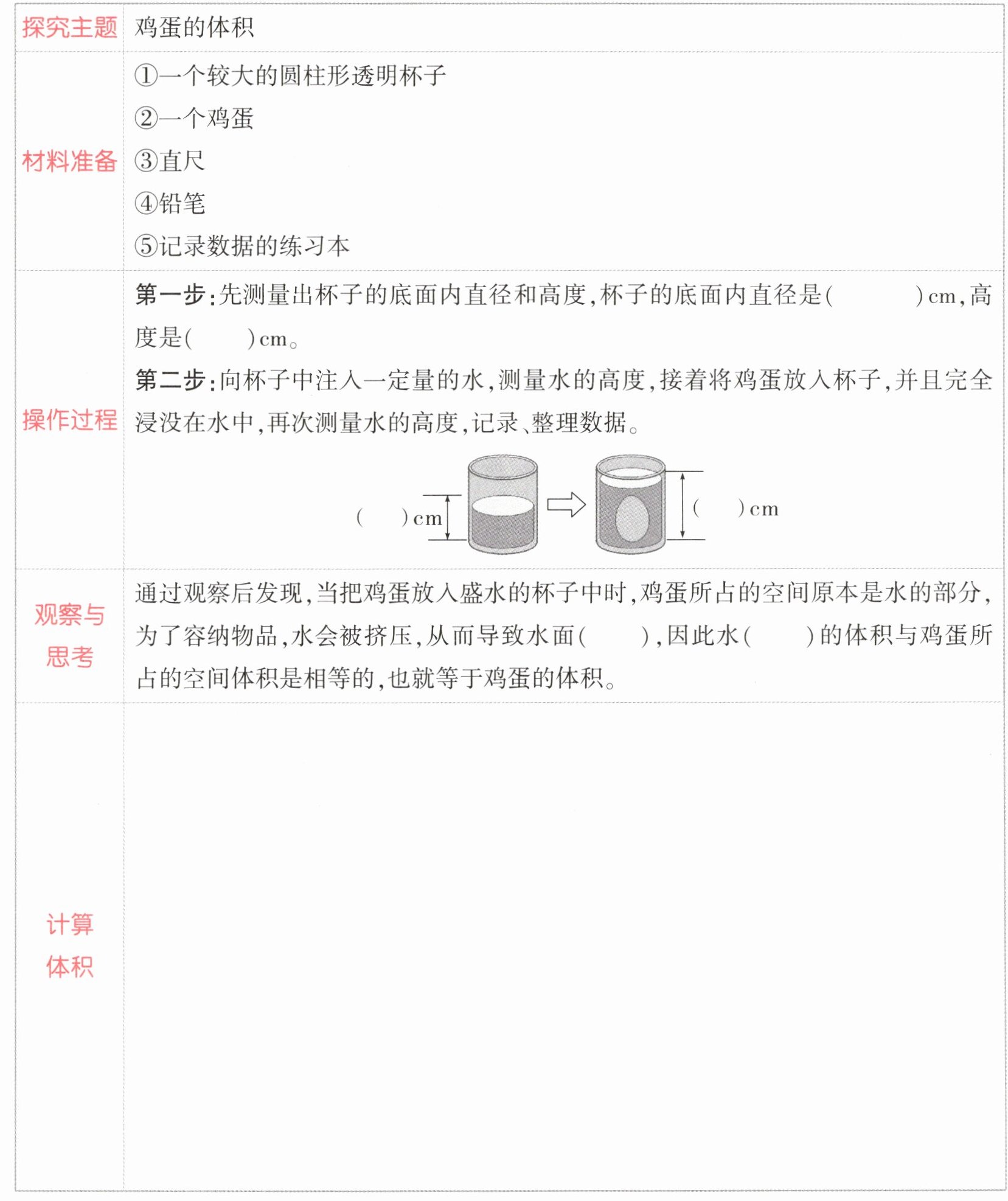 鸡蛋是形状不规则的物体,我准备将鸡蛋的体积转化为水的体积进行计算,下面是我的测量方案