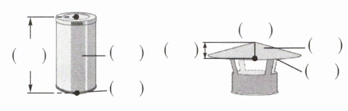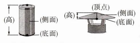 1. 〔连线课堂·图形特征及性质〕摆放垃圾分类桶。下面是幸福小区摆放的垃圾桶及桶盖的图片,请写出各部分的名称。