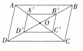右图为平行四边形 $ABCD$,以点 $O$ 为位似中心画缩小后的平行四边形 $A'B'C'D'$,使得它与平行四边形 $ABCD$ 位似,且位似比为 $\frac{1}{2}$。