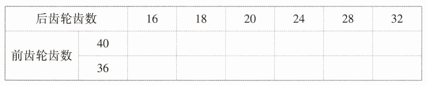 二、计算验证1. 请根据上面的信息填写下表,并计算出前齿轮齿数和后齿轮齿数的最简比。由上表可知,前、后齿轮齿数组成了( )个比,其中有( )个比的最简比相同,所以这种变速自行车可以变化出( )种速度。
