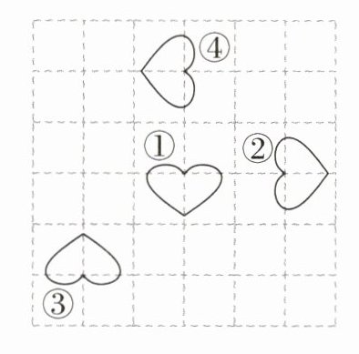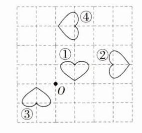 5. 如图,将爱心图案①绕点O逆时针旋转2个90°后得到的是图案( ),并在图中标出O点的位置。