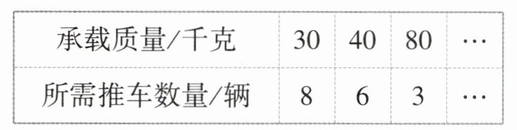 2.(P49第3题变式)购买饮用水。李老师要将购买的饮用水一次全部运送到储物室存放,推车的承载质量(满载)与所需推车的数量如下表。