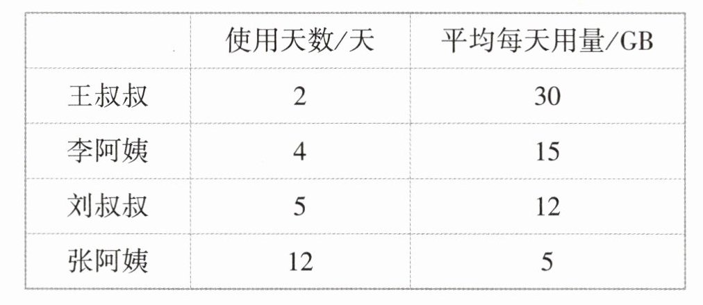 3.(P48第2题变式)王叔叔和三名同事各购买了一份同样的流量套餐,直到套餐内流量用完为止,四人的使用情况如下表。