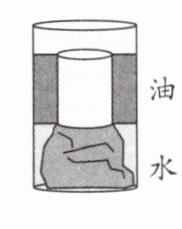 12. 新考法 跨学科试题 有一个足够深的水槽,底面是直径为12 cm的圆,原本在水槽里盛有6 cm深的水和6 cm深的油(油在水的上方),在水槽中放入一个石块和圆柱形铁块后(如图),水层和油层的总高度是15 cm,石块刚好浸没在水中,铁块刚好浸没在油中,已知圆柱形铁块的底面直径是4 cm,则石块的体积是多少立方厘米?