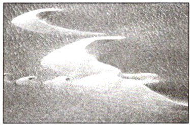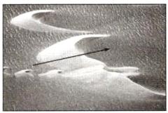 新月形沙丘的纵剖面有两个不对称的斜坡,其中一斜坡两侧形成接近对称的两个尖角,称为沙丘的两翼。