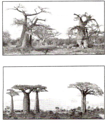 猴面包树又叫波巴布树、猢狲木或酸瓠树,是木棉科、猴面包树属的大型落叶乔木,分布于南非、博茨瓦纳、坦桑尼亚和马达加斯加等国家。树干内部组织中贮水,高约20米。叶集中生于枝顶,小叶长5厘米,长圆状倒卵形,急尖,上面暗绿色发亮,无毛或背面被稀疏的星状柔毛,长9~16厘米,宽4~6厘米;叶柄长10~20厘米。在湿季,猴面包树在枝条上长出3~7片小叶组成的掌状复叶。(下图为不同季节该树的生长状况)