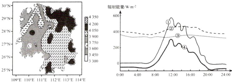 (2024·绍兴高一检测)湖南省是我国太阳辐射能比较丰富的省份。下图为湖南省多年平均太阳辐射(单位:MJ/m²·a)分布图(左图)和C地某日太阳辐射日变化统计图(右图)。据此完成4、5题。