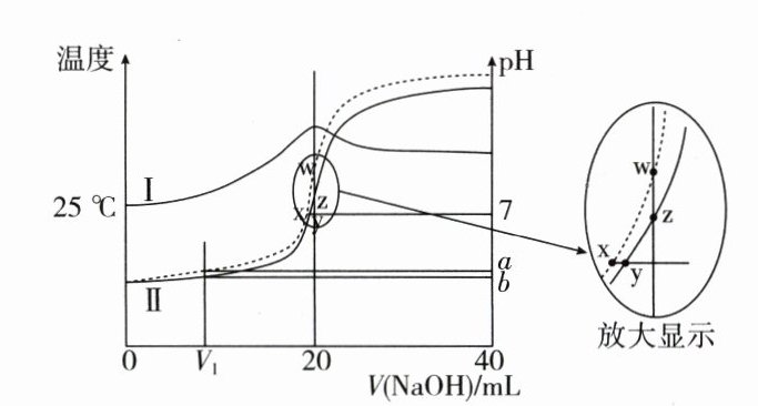 7. (2023·安徽省马鞍山高三二模)用$0.1\ mol/L$的$NaOH$溶液滴定$20\ mL\ 0.1\ mol/L$的$CH_{3}COOH$溶液时,溶液的温度(Ⅰ)、$pH$(Ⅱ)随$NaOH$溶液体积的变化如图(图中虚线为校正至$25^{\circ}C$时的$pH$曲线),$V_{1}$时溶液中$\frac{c(CH_{3}COO^{-})}{c(CH_{3}COOH)} = 1$。下列说法正确的是 ( )